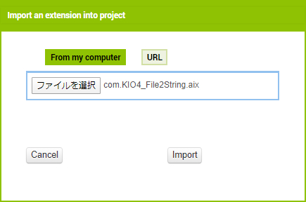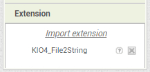 パレットの一番下Extension → Import extension でダウンロードしたcom.KIO4_File2String.aixを選択します。