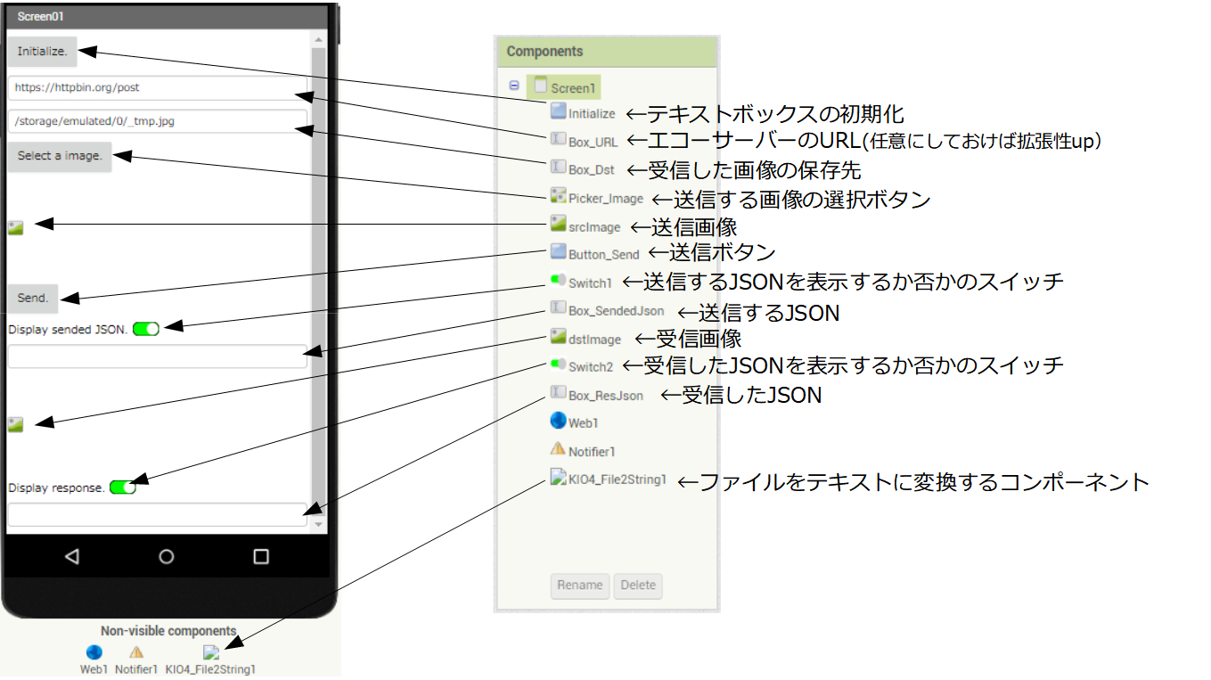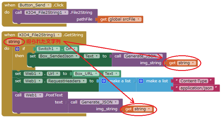 送信ボタンが押された時の処理と、ファイルをテキストに変換してからの処理を指定しています。ここで、「KIO4_File2String」を使用していますが難しいポイントはないと思います。