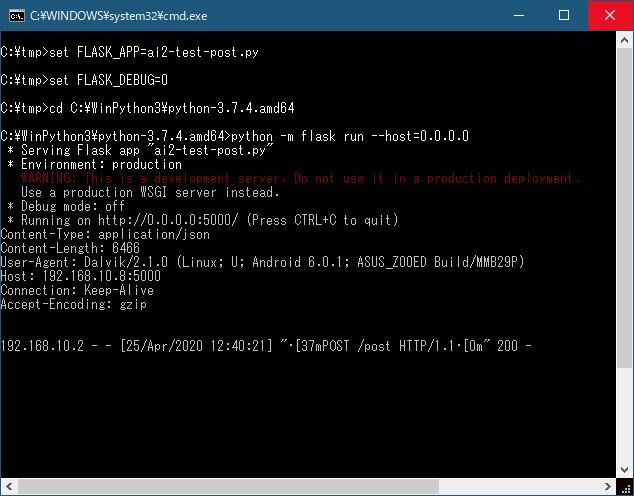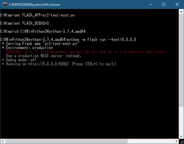 スクリプトの実行は、ai2-test-post.pyをPythonのLibフォルダにコピーし、DOSプロンプト上で以下を実行します。私の環境では、C:\WinPython3\python-3.7.4.amd64にpython.exeがあります。