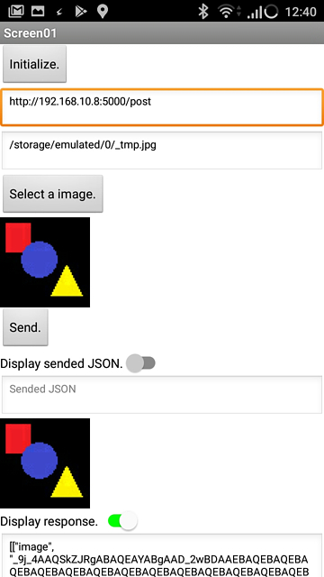return '{"json":{"image":"' + str_enc + '"}}'こちらの「A Minimal Application」、「Routing」、「HTTP Methods」などを参考にしました。