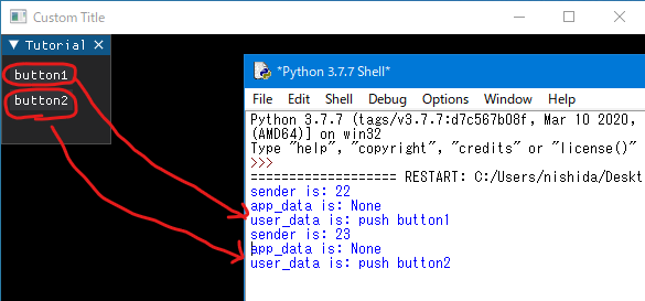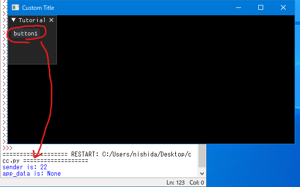 「button1」と表示されたボタンを押すと、コールバック関数(button_callback)が実行され、senderとapp_dataの内容がターミナルに表示されます。