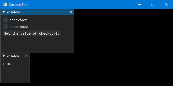 下の例では、「window1」のボタンを押すと、「checkbox1」の値を取得して、「window2」にその値を表示します。