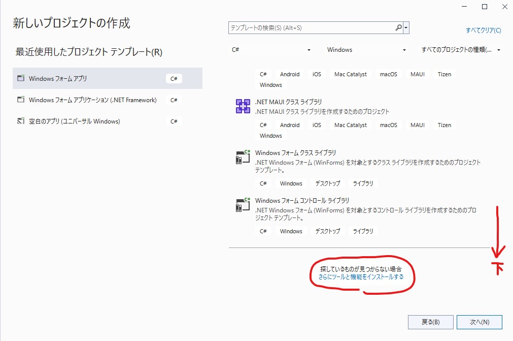 右側のリストをスクロールバーを一番下にして、「さらにツールと機能をインストールする」をクリックしてください。