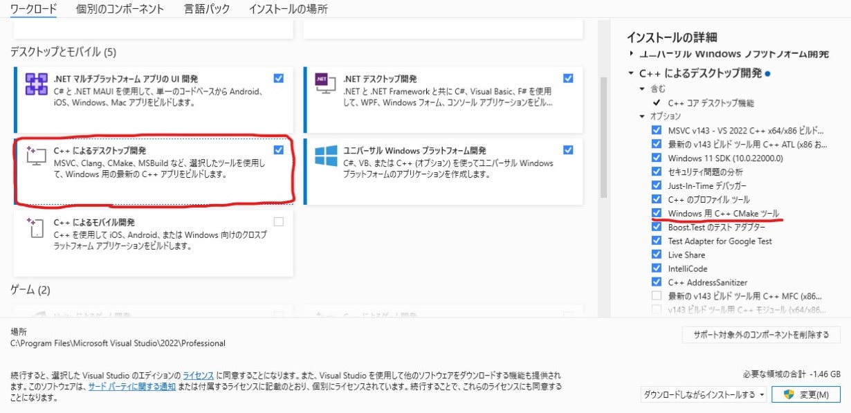「C++によるデスクトップ開発」のチェックをONにし、「Windows用C++ Cmakeツール」がONか確認してください。ONでなければ、ONにしてください。