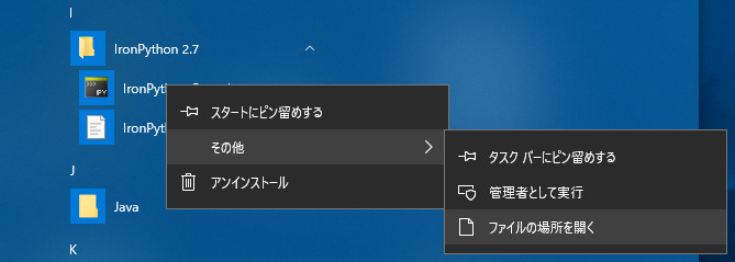 まず、IronPythonのメニューを開き、IronPython Consoleのショートカットを右クリックし、「その他」、「ファイルの場所を開く」を順に選択します。