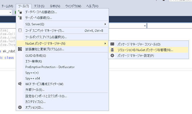 ツール ⇒ NuGetパッケージ マネージャー ⇒ ソリューションのNuGetパッケージの管理
