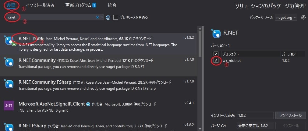 ①参照 ⇒ ②r.netを入力し検索 ⇒ ③R.NETを選択 ⇒ ④チェックボックスをON ⇒ ⑤インストール