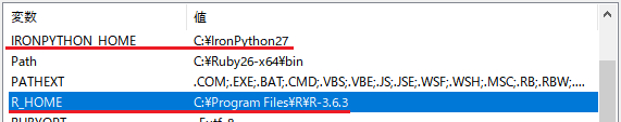 (6) 環境変数「R_HOME」(Rのインストールフォルダ)と「IRONPYTHON_HOME」(IronPythonのインストールフォルダ)を設定します。