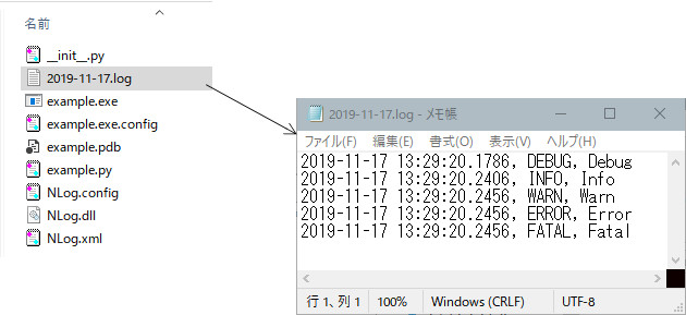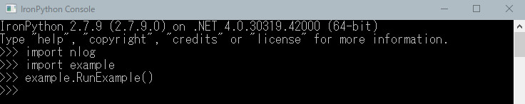example.pyも用意しています。IronPythonのコンソールを起動し、以下のスクリプトを実行すればログがnlogフォルダ出力されます。