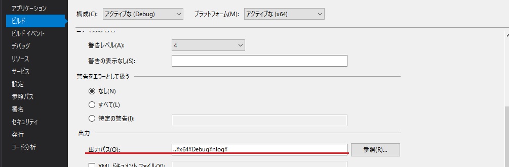 ..\x64\[Release or Debug]\nlog\にしています。「ExampleOfNLog」プロジェクトのプロパティを確認してください。