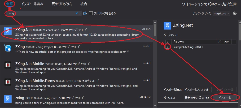 - NugetでZXing.Netをインストールします。