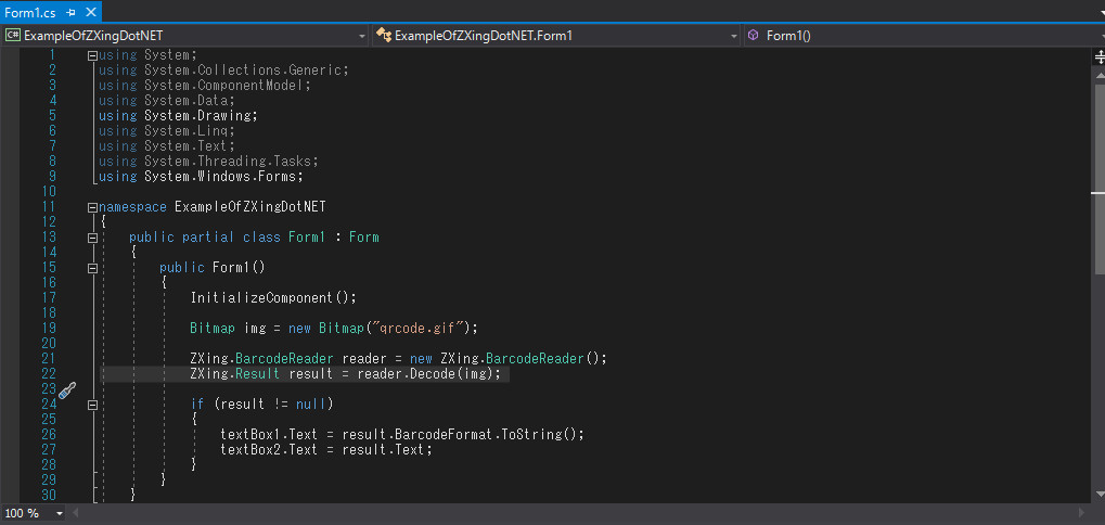 - 上のサンプルでは「Form1.cs」に簡易なテストプログラムを書いています。
