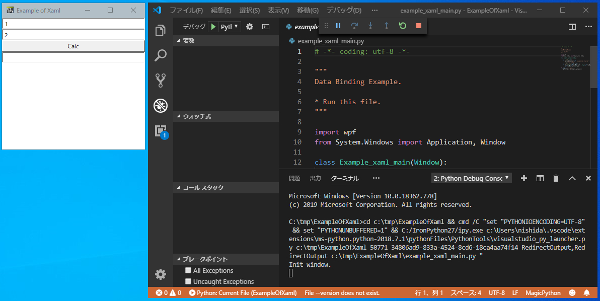 正常に動作するとウィンドウ(Example of Xaml)が表示されます。Calcを押すと足し算の結果がテキストボックスに表示されます。