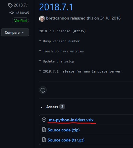 Visual Studio Codeの拡張機能の「別のバージョンをインストール」のリストに「2018.7.1」が表示されなくなってしまいました。リポジトリから直接ダウンロードしてインストールします。