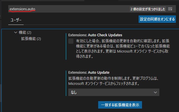 ファイル -> ユーザー設定 -> 設定 -> 検索バーに「extensions.auto」まで入力すると以下の項目が表示されます。