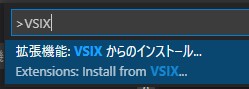 次に、[F1]キーを押し、表示された入力ボックスに「vsix」と入力すると、「拡張機能: VSIX:VSIからのインストール」が表示されますので選択します。