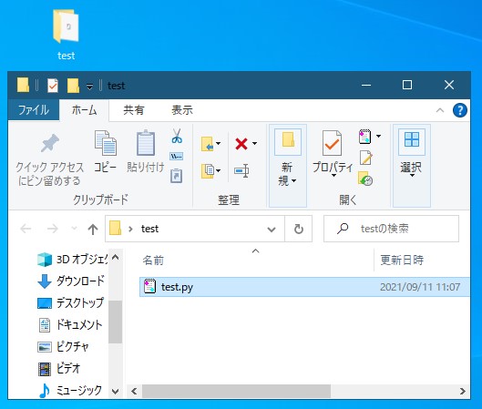 実際にデバッグを試してみるためにサンプルを作成します。testフォルダを作成し、そのフォルダ内にtest.pyを作成します。