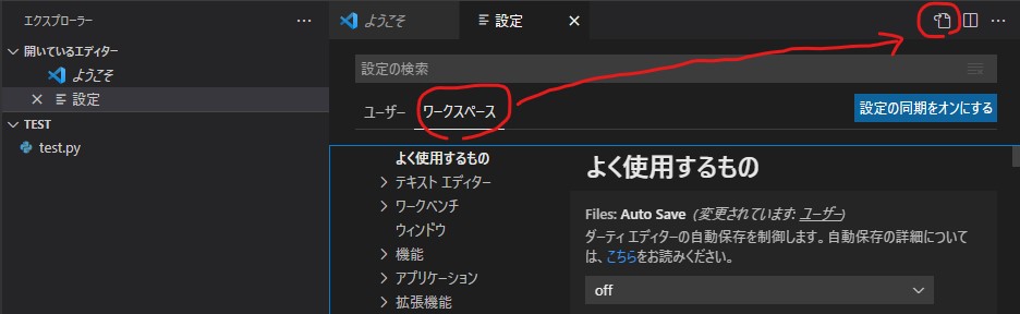 ファイル-ユーザー設定ー設定(v1.81.1の場合)