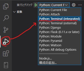 デバッグと実行 -> 「Python: Terminal (Integrated)」