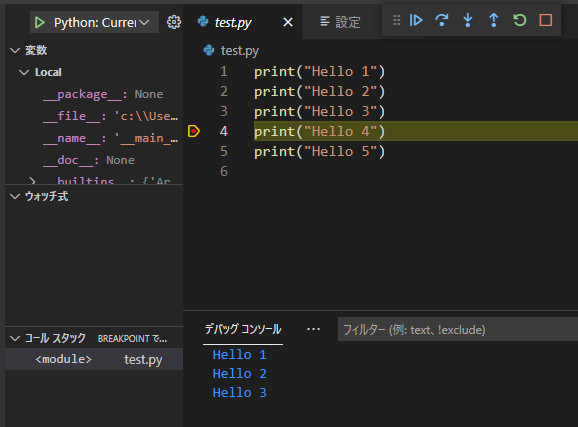「デバッグの開始」ボタン(緑色の三角形のアイコン)を押すと実行できます。ブレークポイントも使えます。