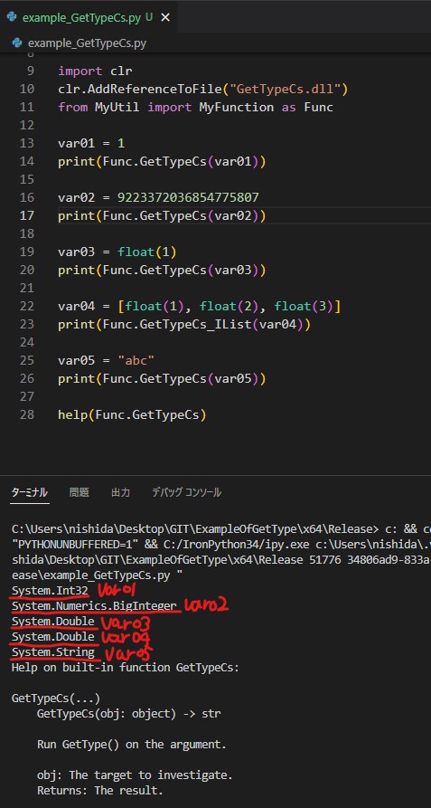 }GetTypeCs.slnを開きReleaseビルドしてから、ReleaseフォルダをVisual Studio Codeで開き(手順はこちらを参考にしてください)、example_GetTypeCs.pyを実行してください。