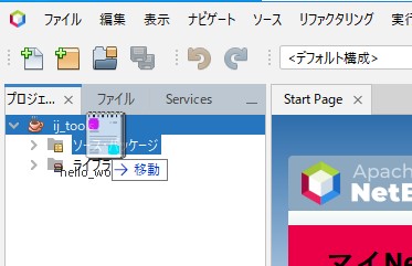 ”ファイル”ウィンドウのsrcフォルダに、ダウンロードした「hello_world.java」をドラッグ&ドロップします。