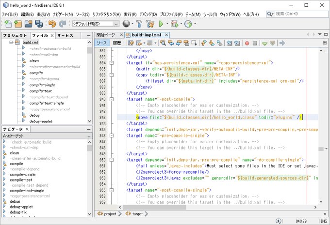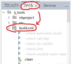 実際に編集されるファイルは、「nbproject」フォルダの「build-impl.xml」です。