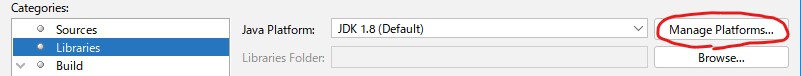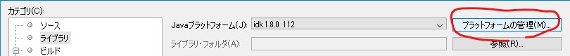 - Javaプラットフォームを選択します。もし新しく追加する場合は、プラットフォームの管理 ⇒ プラットフォームの追加を行ってください。