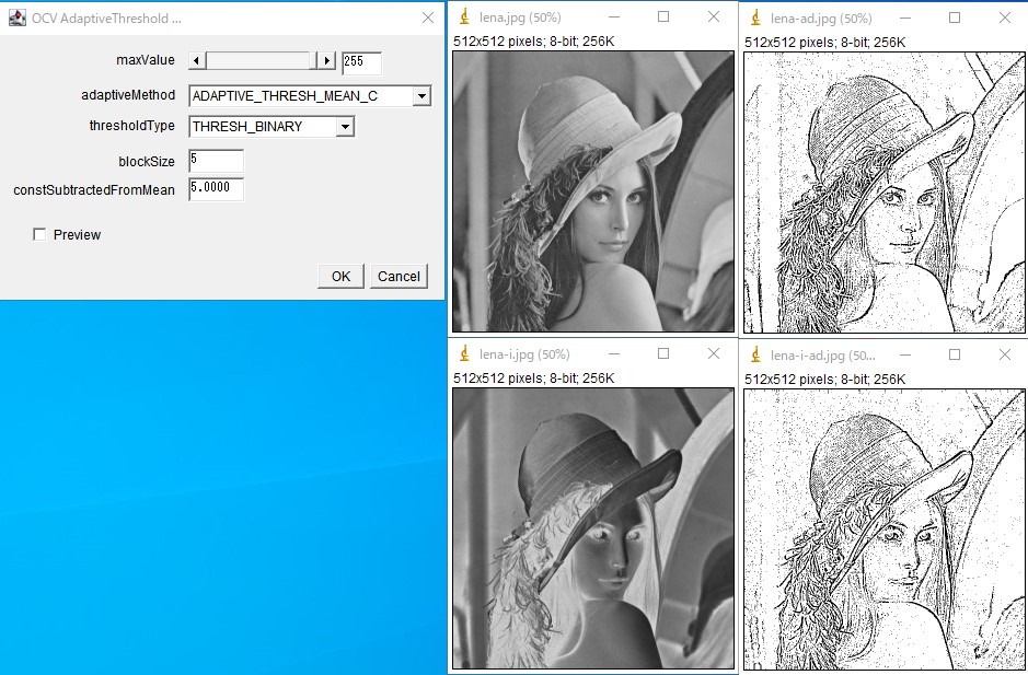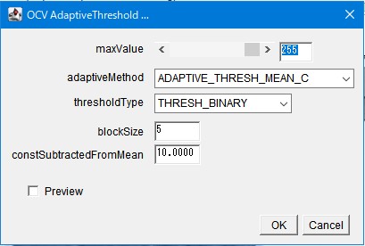 - adaptiveMethod: 閾値計算のアルゴリズムを「平均値(MEAN)」か「ガウス加重平均(GAUSSIAN)」から選択します。