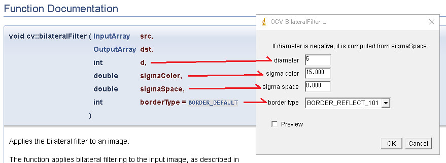 (左がOpenCVのサイトのドキュメント、右がプラグインのダイアログです)