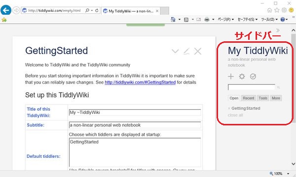 新しい「Tiddler」(記事)を作成するには、サイドバーの