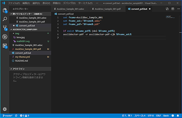 まず、以下のようなconvert_pdf.batというファイルを、編集しているAsciiDoc形式ファイルと同じフォルダに作成します。