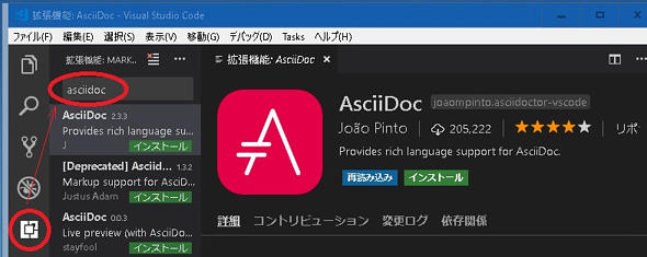 まず、拡張機能のボタンを押し、検索ボックスに「asciidoc」を入力します。João Pinto氏の作成した「AsciiDoc」を利用します。ライブプレビューやシンタックスハイライトなどの便利な機能があります。