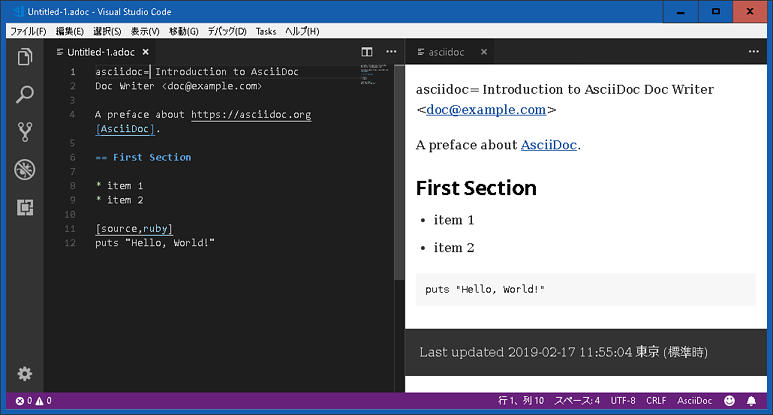 AsciiDocの可読性が良いとは言っても、Windowsのメモ帳を使って編集するのは厳しいです。プレビューなどの機能が欲しいところです。