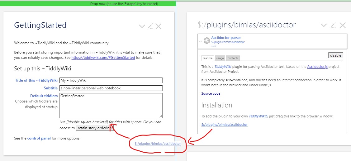 $:/plugins/bimlas/asciidoctorを自分のブラウザ ウィンドウのTiddlyWiki5にドラッグ&ドロップし、インポートするだけです。