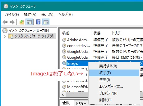 タスクスケジューラの「終了」でImageJも終了してほしいところですが、無理でした。