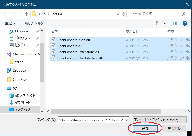 - 「wk_util_opencvsharp」プロジェクトの参照に、 「OpenCvSharp.Blob.dll」、「OpenCvSharp.dll」、「OpenCvSharp.Extensions.dll」、「OpenCvSharp.UserInterface.dll」を追加します。