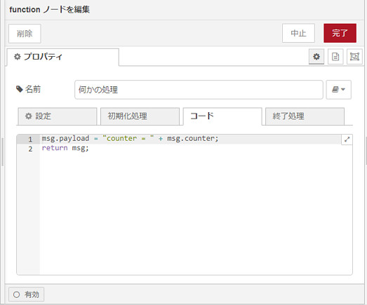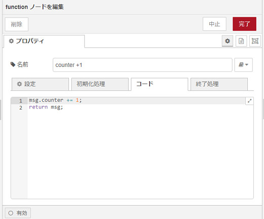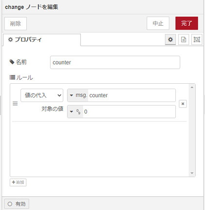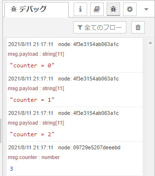 まず、「change」ノードでカウンター(msg.counter)を初期化します。