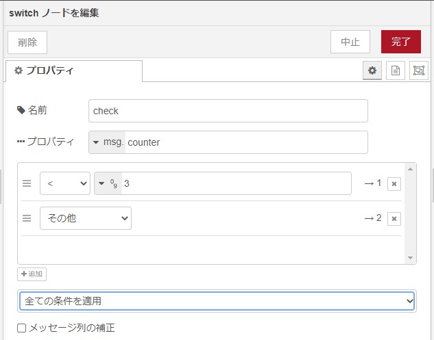 次に、「switch」ノードでカウンターをチェックします。3未満なら処理を続け、3以上ならカウンターを表示して終わります。