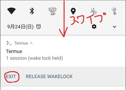 Termuxを終了するのは、スマホの上部を上から下にスワイプし、Termuxの「Exit」をタップしてください。