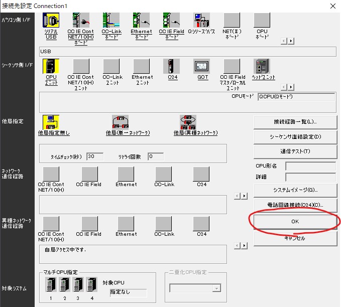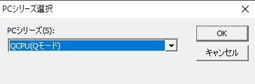 「PCシリーズ選択」ダイアログにおいて、「QCPU(Qモード)」を選択して、OKを押します。