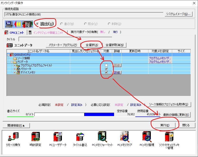 「オンラインデータ操作」ダイアログにおいて、「読出」 -> 「全選択」 (今回の例ではプログラムはチェックOFF。ラダーは1から作ります。) -> 「実行」。
