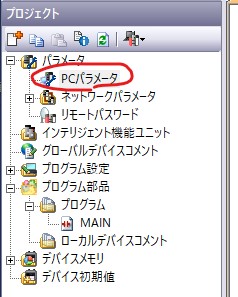 読み込みが完了したら、プロジェクトの「パラメータ」 -> 「PCパラメータ」。以下、IPアドレスなどの通信設定やプログラムの登録を行います。