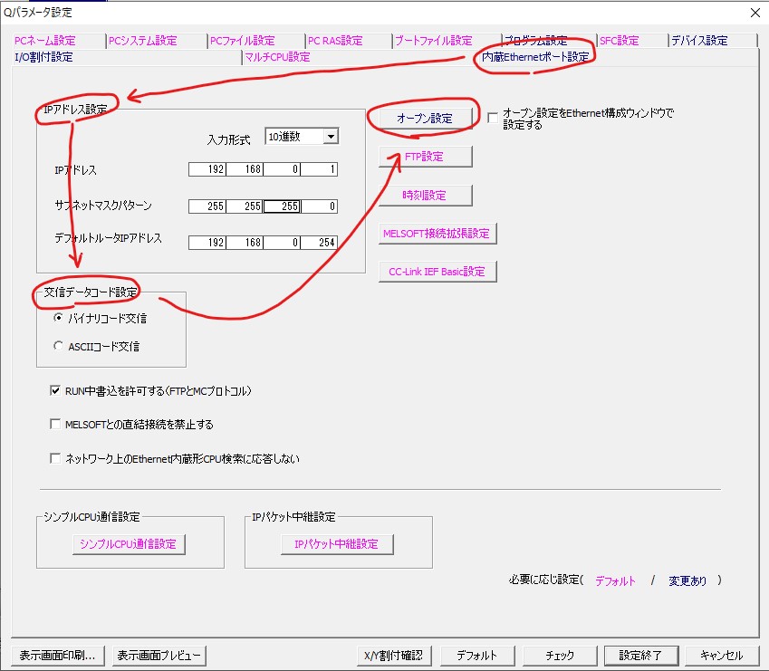 「内臓Eathernetポート設定」タブ -> PLCのIPアドレス設定 -> 更新データコード設定(今回はバイナリコード交信) -> 「オープン設定」ボタン