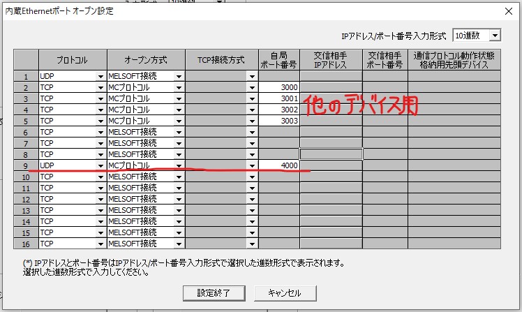 「内臓Eathernetポート設定 オープン設定」において、16個のうちの一つにNode-RED用の設定を行います。(1と16は空けておくのが良いです)