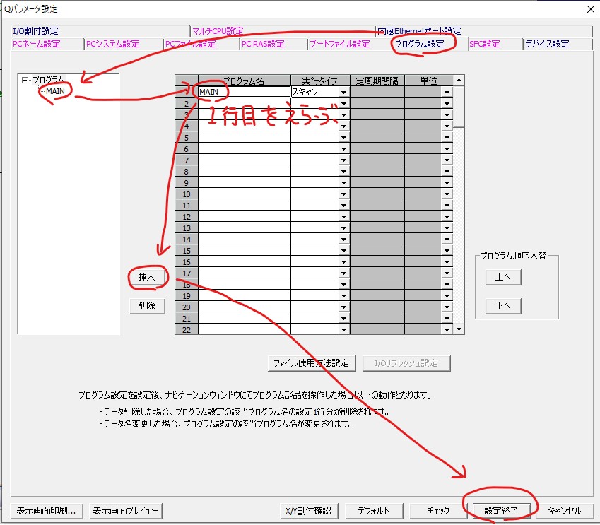「プログラム設定」タブ -> 左側の「MAIN」を選択 -> 右側の表の1行目を選択 -> 「挿入」ボタン -> 「設定終了」ボタン