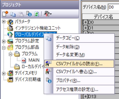 をローカルPCに保存して、GX Worksのプロジェクトの「グローバルデバイスコメント」を右クリックし、「CSVファイルからの読出」を実行してください。特殊デバイスのデバイスコメントの一部が登録されます。