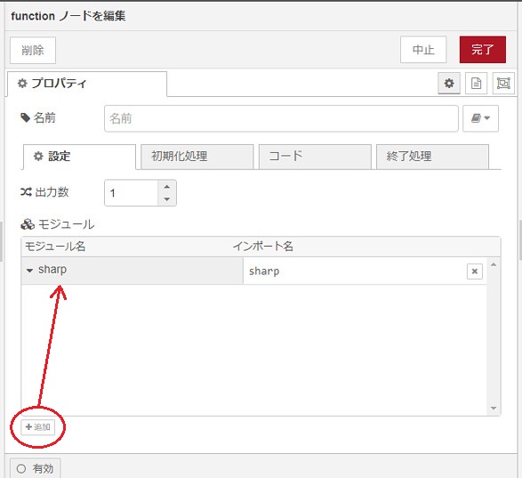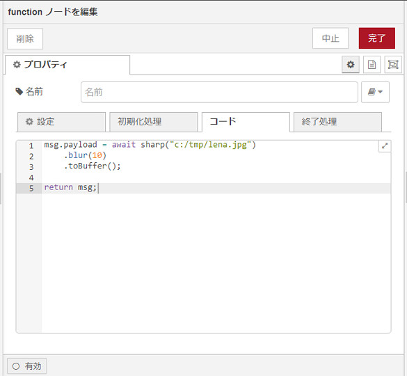> npm install sharpNode-REDのバージョン1.3以降の「Functionノードにおける外部npmモジュールの簡単に利用できる」機能を使えば、簡単に使えます。