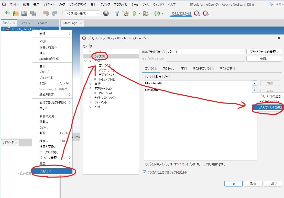 まず、ライブラリで「ij.jar」「opencv-000.jar」を追加します。