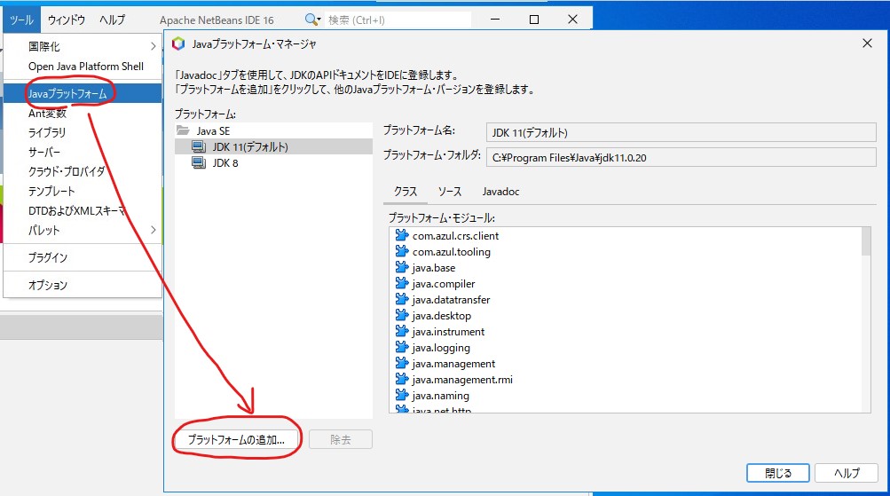 NetBeansのプラットホームに「JDK[空白]17」が必要なので、無い場合は作成します。